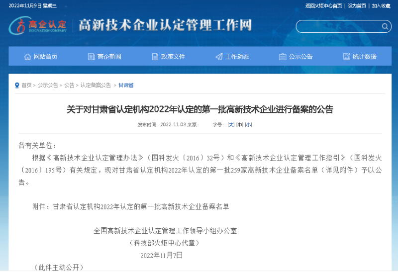 近日,國家高新技術企業(yè)認定管理工作領導小組辦公室發(fā)布了甘肅省認定機構2022年認定的第一批高新技術企業(yè)備案公告,建研建設公司位列其中,成功通過了國家高新技術企業(yè)復審。