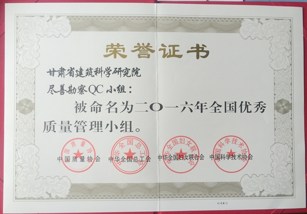 全國(guó)第三十八次質(zhì)量管理小組代表會(huì)議于2016年9月20日在浙江省嘉興市召開(kāi)。會(huì)上,由甘肅省建筑科學(xué)研究院勘察分院盡善勘察小組申報(bào)的《提高重型動(dòng)力觸探試驗(yàn)準(zhǔn)確率》成果,被甘肅省質(zhì)量協(xié)會(huì)推薦為全國(guó)優(yōu)秀QC小組成果,并被中國(guó)質(zhì)量協(xié)會(huì)、中華全國(guó)總工會(huì)、中華全國(guó)婦女聯(lián)合會(huì)和中國(guó)科學(xué)技術(shù)協(xié)會(huì)聯(lián)合授予“二〇一六年全國(guó)優(yōu)秀質(zhì)量管理小組”。