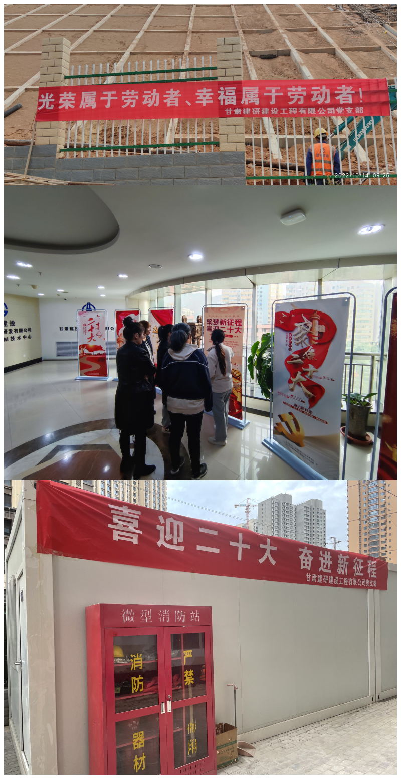 黨的二十大召開之際,甘肅建科院的辦公樓、項目現(xiàn)場裝扮一新,“喜迎二十大,奮進新征程”等主題的景觀,營造出祥和喜慶的氛圍。鮮花、黨旗、黨徽和催人奮進的標語,凸顯全司職工凝心聚力謀發(fā)展,奮發(fā)有為迎盛會的喜悅。