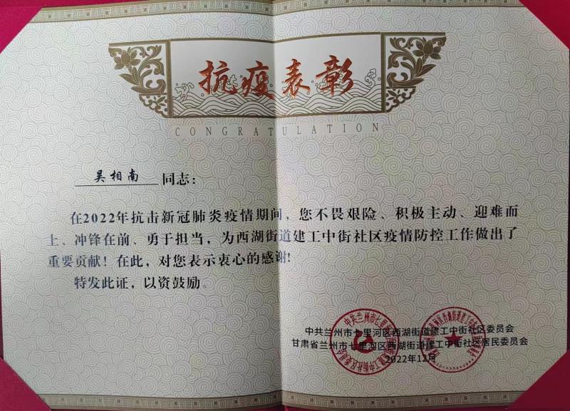 面對(duì)疫情,甘肅建科院積極行動(dòng),彰顯社會(huì)擔(dān)當(dāng)。2022年7月,甘肅建科院職工主動(dòng)請(qǐng)纓投身到志愿者隊(duì)伍中,在志愿者崗位上為抗擊疫情貢獻(xiàn)力量。甘肅建科院市政公路專業(yè)事業(yè)部吳相南被蘭州市七里河區(qū)西湖街道建工中街社區(qū)委員會(huì)和居民委員會(huì)授予榮譽(yù)證書。8月4日,甘肅建科院黨委慰問日夜奮戰(zhàn)在防疫一線的醫(yī)護(hù)人員、社區(qū)工作者及青年志愿者,為他們送去抗疫物資,助力蘭州疫情防控工作。