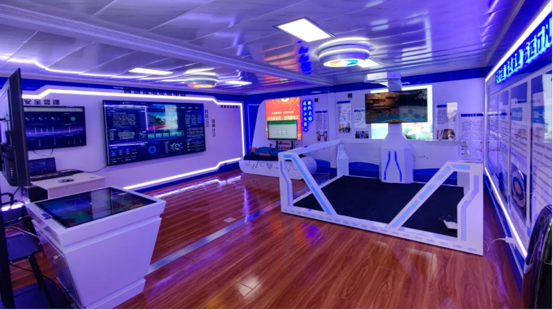 展廳是旅客過夜用房項(xiàng)目的重要組成部分,具有多項(xiàng)功能。決策中心顯示大屏實(shí)時(shí)展示工地的各項(xiàng)數(shù)據(jù),包括施工進(jìn)度、安全指標(biāo)、環(huán)境監(jiān)測等,為管理人員提供決策依據(jù)。安全管理顯示大屏展示工地的安全情況,包括監(jiān)控畫面和報(bào)警信息,以保障工人的安全?,F(xiàn)場急救體驗(yàn)系統(tǒng)的安裝提高了工人的風(fēng)險(xiǎn)意識和應(yīng)急處置能力。此外,VR安全體驗(yàn)設(shè)備和黨建互動(dòng)展廳設(shè)備的安裝也為管理人員及工人提供了一系列安全模擬體驗(yàn)和黨務(wù)知識傳遞。