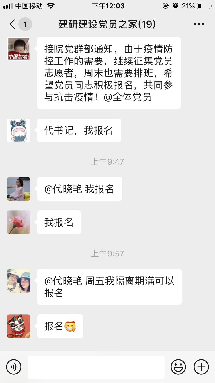 筑牢生命防線(xiàn),踐行初心使命,共產(chǎn)黨員責(zé)無(wú)旁貸。面對(duì)疫情下的復(fù)工復(fù)產(chǎn),建科院建研建設(shè)公司的黨員頂上去,沖在前,踐行著入黨時(shí)許下的錚錚誓言。2020年2月4日,建研建設(shè)公司黨支部發(fā)起主題黨日活動(dòng)“倡議我響應(yīng),防控我行動(dòng)”。疾風(fēng)知?jiǎng)挪荩?月7日建研建設(shè)公司建立黨員責(zé)任區(qū),征集志愿者,廣大黨員踴躍報(bào)名,迎難而上,沖鋒在前,無(wú)私奉獻(xiàn),積極投入到疫情防控工作中。