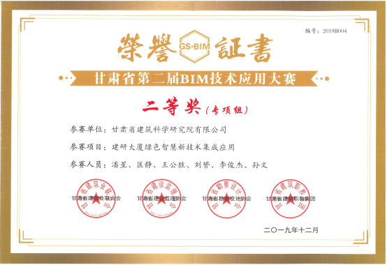 大會為省建科院頒發(fā)了甘肅省第二屆 BIM 技術(shù)應(yīng)用大賽專項組二等獎榮譽(yù)證書。由甘肅省建筑業(yè)聯(lián)合會、甘肅省勘察設(shè)計協(xié)會、甘肅省建設(shè)監(jiān)理協(xié)會、甘肅省建筑職教集團(tuán)、甘肅建筑職業(yè)技術(shù)學(xué)院、甘肅益埃畢建筑科技有限公司共同舉辦的甘肅省第二屆 BIM 技術(shù)應(yīng)用大賽,旨在進(jìn)一步促進(jìn) BIM 技術(shù)在我省工程建設(shè)領(lǐng)域的普及應(yīng)用,鼓勵創(chuàng)新實(shí)踐,弘揚(yáng)創(chuàng)新文化,加速建筑類高校 BIM人才培養(yǎng)。在本次大賽中,省建科院“建研大廈綠色智慧新技術(shù)集成應(yīng)用”項目通過初審、終審答辯等環(huán)節(jié),獲得了專項組二等獎。