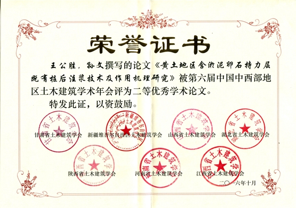 會議分三部分進行:首先是秘書長聯(lián)席會,通報第六屆會議準備情況,并探討中西部學會的發(fā)展情況;其次是開幕式及學術交流,共有王秀麗等9位教授或高級工程師做主題交流;最后頒發(fā)了西部土木工程防災減災青年人才工程獎、中國中西部地區(qū)土木建筑杰出工程師獎、優(yōu)秀論文獎三類獎項。在頒獎儀式上,我院四篇論文分獲第六屆中國中西部地區(qū)土木建筑學術年會二、三等獎。其中二等獎3項,分別是:王公勝、孫文同志撰寫的《黃土地區(qū)含淤泥卵石持力層既有樁后注漿技術及作用機理研究》;李建華、王滿勝、張福彪、孫永卓同志撰寫的《深基坑降水井的技術創(chuàng)新研究與應用》;祁曜剛同志撰寫的《蘭州新區(qū)某削山整平場地大厚度黃土勘察的若干要點總結》;三等獎1項,即賈軍國同志撰寫的《某二層混凝土框架結構在增層改造中擬采用層間隔震技術后的性能研究》。