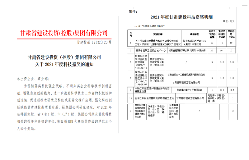 公司《既有多層住宅新增電梯改造關鍵技術應用研究與推廣》榮獲中國建筑金屬結構協(xié)會科學技術獎優(yōu)秀獎;7項成果獲建投科技嘉獎,獲甘肅建投優(yōu)秀工法1項。