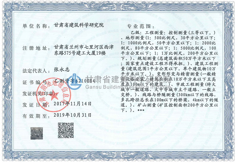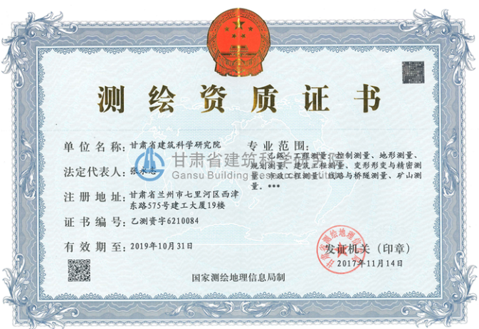 日前,從甘肅省測(cè)繪地理信息局傳來喜訊,我院測(cè)繪資質(zhì)(工程測(cè)量)丙級(jí)升乙級(jí)順利通過審核,取得測(cè)繪乙級(jí)(工程測(cè)量)資質(zhì)證書,這標(biāo)志著我院在工程測(cè)量方面的業(yè)務(wù)范圍進(jìn)一步拓展,專業(yè)能力及水平進(jìn)一步提升。