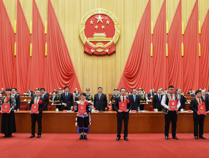 習(xí)近平等為受表彰的個(gè)人和集體代表頒獎(jiǎng)。